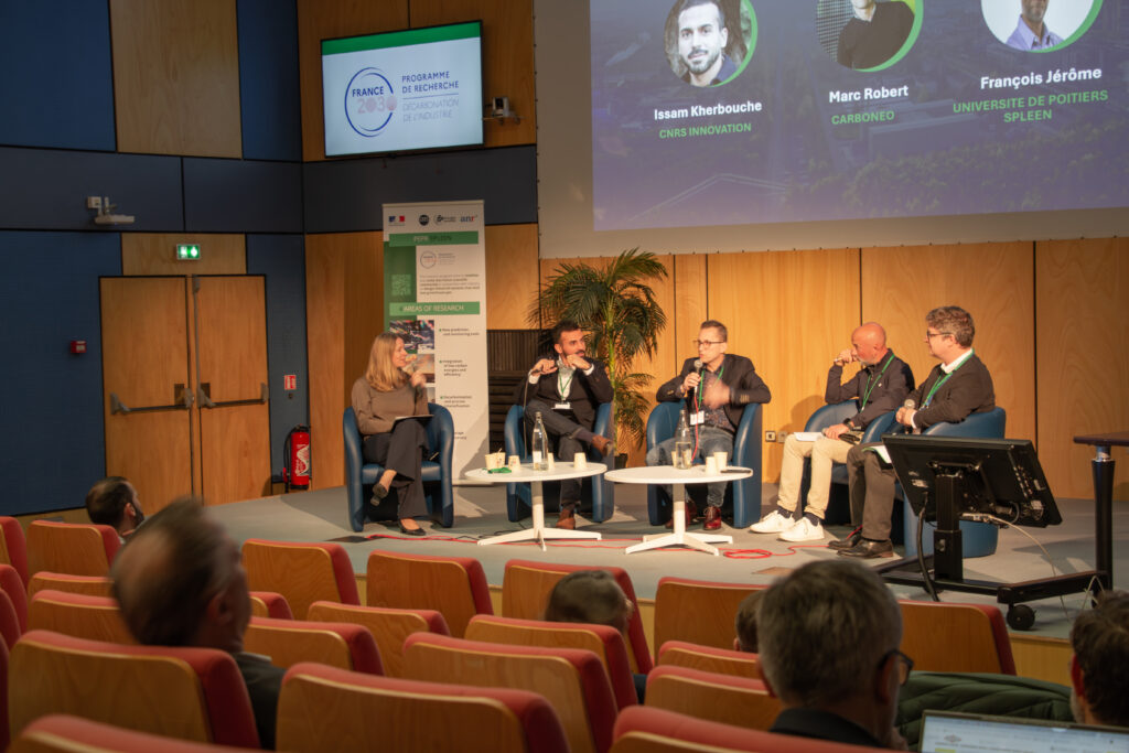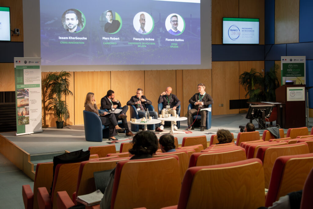 La table ronde “Leveraging research results and turning them into transferable assets for industry” a réuni Issam Kherbouche (CNRS Innovation), Marc Robert (Carboneo, Sorbonne Université), François Jérôme (Université de Poitiers, SPLEEN) et Florent Guillou (IFPEN, SPLEEN). Les échanges ont porté sur la transformation des résultats scientifiques en solutions industrielles concrètes et les opportunités de financement et d’accompagnement pour soutenir l’innovation.